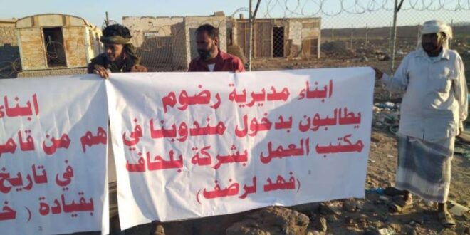 وطالب أبناء مديرية رضوم الواقعة على ساحل بحر العرب، اليوم الأحد بحصتهم في التوظيف بالشركات النفطية، مؤكدين في الوقفة الاحتجاجية أمام منشأة بلحاف الغازية رفضهم لسياسة الاقصاء والتهميش والحرمان التي تطالهم.