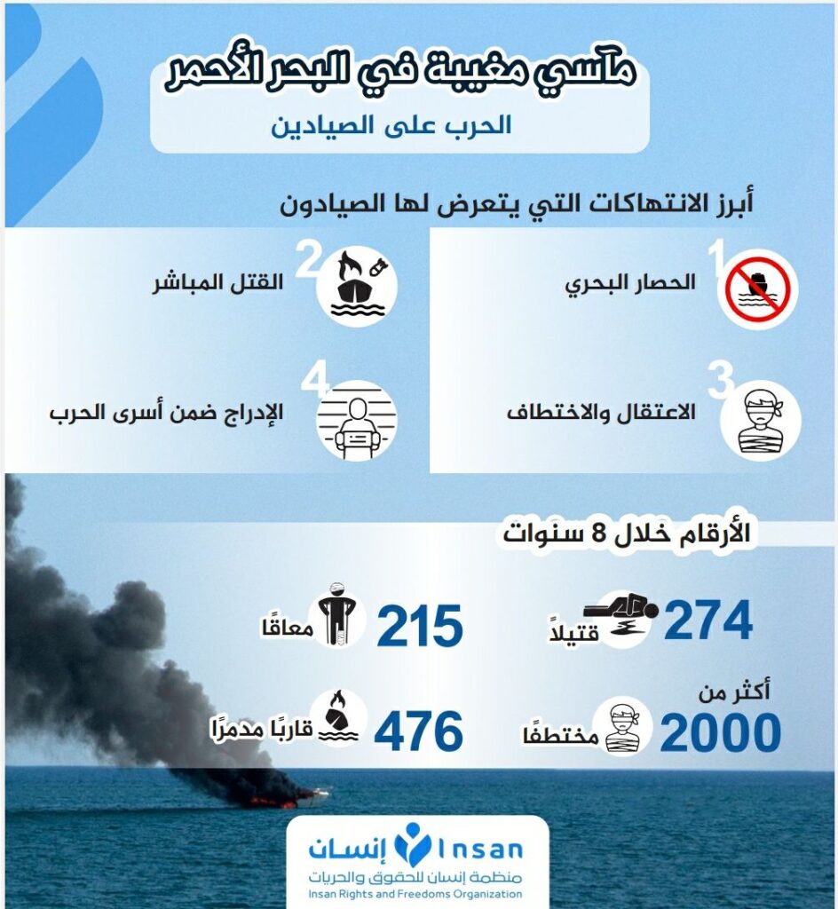 وأوضحت المنظمة في مؤتمر صحفي نظمته اليوم، لاستعراض تقريرها الحقوقي “مآسي مغيبة في البحر الأحمر”، أن الفريق التابع للمنظمة أشار في تقريره إلى وجود 4 أشكال للانتهاكات بحق الصيادين تمثلت في الحصار البحري، والاعتقال، والاختطاف، والقتل المباشر، وإقحام الصيادين المخفيين في تبادلات خاصة بالأسرى.