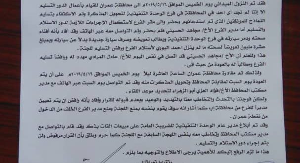 الى ذلك شكت لجنة مصلحة الضرائب والمكلفة بالنزول الميداني لفرع الوحدة التنفيذية لضريبة مبيعات القات بمحافظة عمران لاجراء دور التسليم والاستلام بين السلف والخلف تنفيذا لقرار المصلحة رقم 15من رفض مدير مكتب المحافظ وتهديده لاعضاء اللجنة معلنا رفضه القاطع لتنفيذ القرار او اجراء دور التسليم والاستلام.
