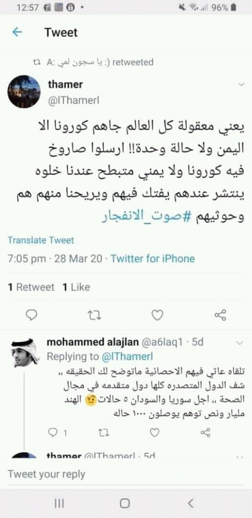 طالب مغردون سعوديون وناشطون على مواقع التواصل الاجتماعي نظام بلادهم الذي يشن حربا عدوانية على اليمن منذ اكثر من خمس سنوات بتكثيف جهودها لادخال فيروس كورونا الوبائي الى اليمن