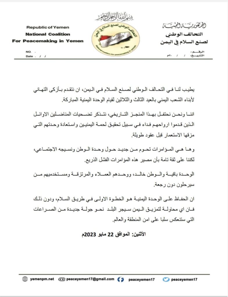 هنأ التحالف الوطني لصنع السلام في اليمن، أبناء الشعب اليمني بالعيد الثالث والثلاثين لقيام الوحدة اليمنية المباركة.