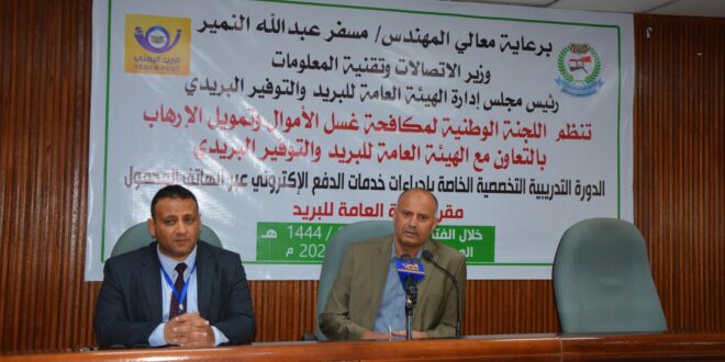 بدأت اليوم بصنعاء دورة تدريبية حول إجراءات خدمة الدفع الإلكتروني عبر الهاتف المحمول تنظمها اللجنة الوطنية لمكافحة غسل الأموال وتمويل الإرهاب بالتعاون مع الهيئة العامة للبريد والتوفير البريدي.