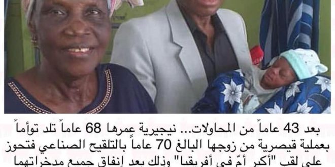 وقالت وسائل اعلام نيجيرية بان السيدة البالغة من العمر 68 عاماً انجبت توأماً بعملية قيصرية من زوجها البالغ 70 عاماً بالتلقيح الصناعي لتحوز على لقب “أكبر أمّ في #أفريقيا” وذلك بعد إنفاق جميع مدخراتهما من أجل الإنجاب تضمنت 3 تجارب فاشلة لأطفال الأنابيب.. ووصف الأطباء ولادة هذه السيدة المسنة لتوامين بـ “المعجزة”