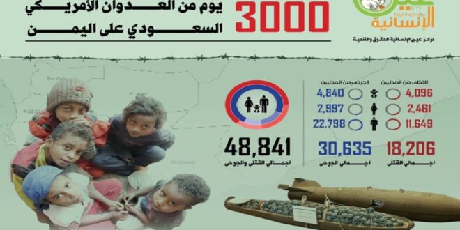 أصدر مركز عين الإنسانية ، اليوم الأحد، إحصائية 3000 يوم من العدوان الأمريكي السعودي على اليمن.
