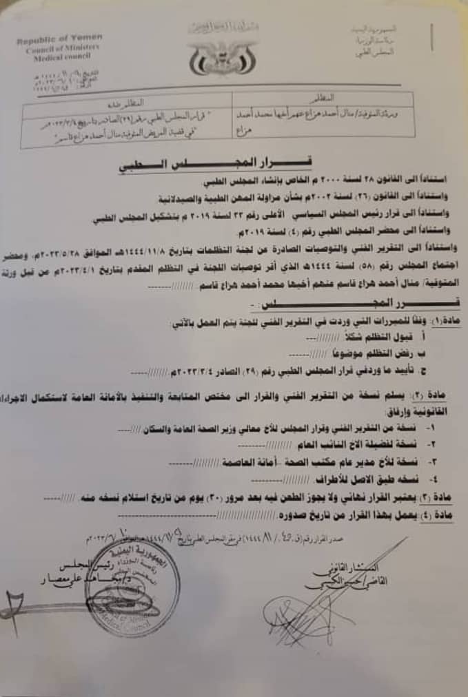 وكان المجلس قد استند في حيثيات قراره إلى التقرير الفني الصادر عن لجنة التحقيق والمساءلة والرقابة على أداء مزاولي المهن الطبية ومحضر اجتماع المجلس رقم 27 لسنة 1444هـ الذي أقر توصيات اللجنة في الشكوى المقدمة عن محمد أحمد هزاع أخو المريضة المتوفاة ضد مستشفى جامعة العلوم والتكنولوجيا بأمانة العاصمة والطبيب فؤاد محسن علي شمسان الشويع بتاريخ 8 / 11 / 2022.
