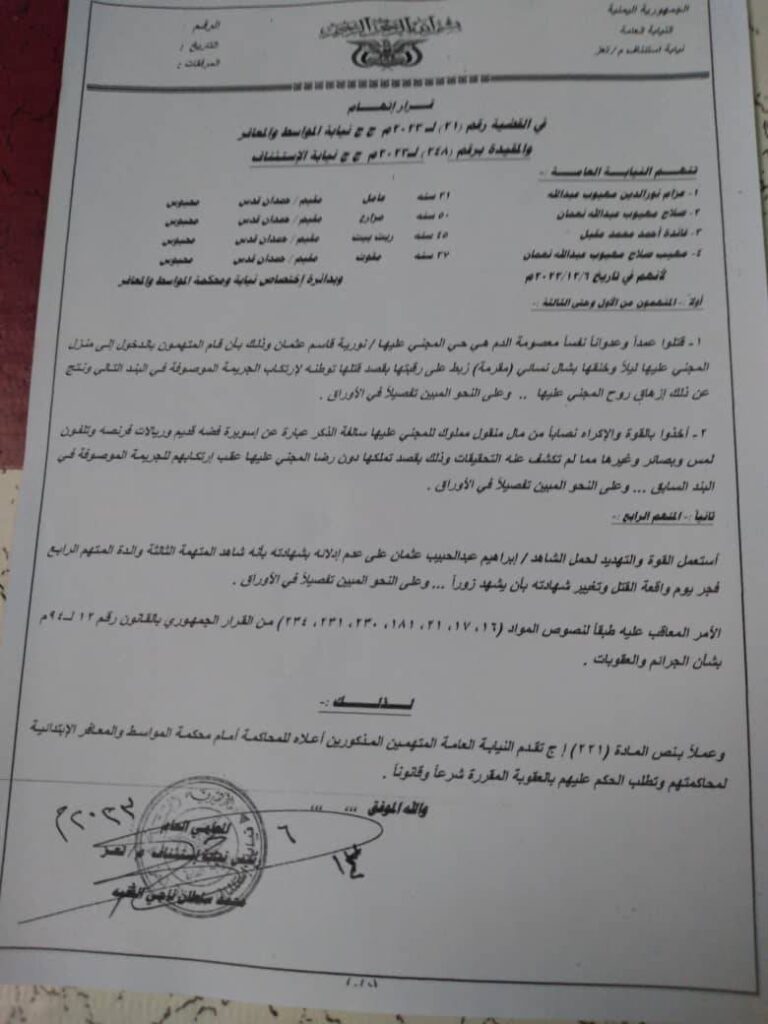 وقالت النيابة في عريضة الاتهام ان كلا من عزام نور الدين مهيوب عبدالله وصلاح مهيوب عبدالله نعمان وفائدة أحمد محمد مقبل ومهيب صلاح مهيوب عبدالله نعمان وجميعهم محبوسين قتلوا ظلما وعدوانا نفسا معصومة الدم وهي المجني عليها نورية قاسم عثمان ونهب اموالها ويجب تطبيق نص القانون لينالوا جزاءهم الرادع.