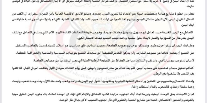 كما دعا البيان ابناء اليمن الى الالتفاف حول وطنهم ، والتمسك بوحدتهم و هويتهم الجامعة، ومصدر انتمائهم ، فاي مساس بها هو استلاب للسيادة وعبث بالحاضر والمستقبل.