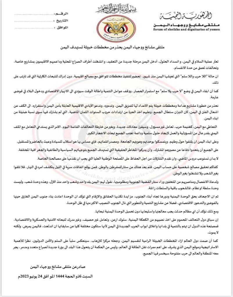 ملتقى مشايخ ووجهاء اليمن يحذّر من مغبّة التعامل مع اليمن كغنيمة حرب