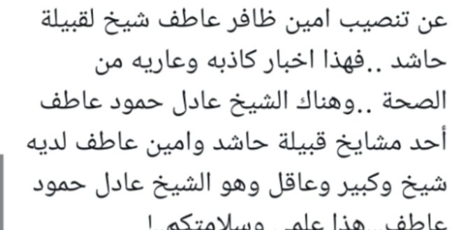 نفى وجهاء ومشايخ وشخصيات اجتماعية بارزة من أبناء قبيلة حاشد نفيا قاطعا صحة ما تداولته مواقع اخبارية واجتماعية مؤخرا عن انعقاد اجتماع للقبيلة وتنصيب الشيخ أمين ظافر شيخا لمشايخ حاشد.