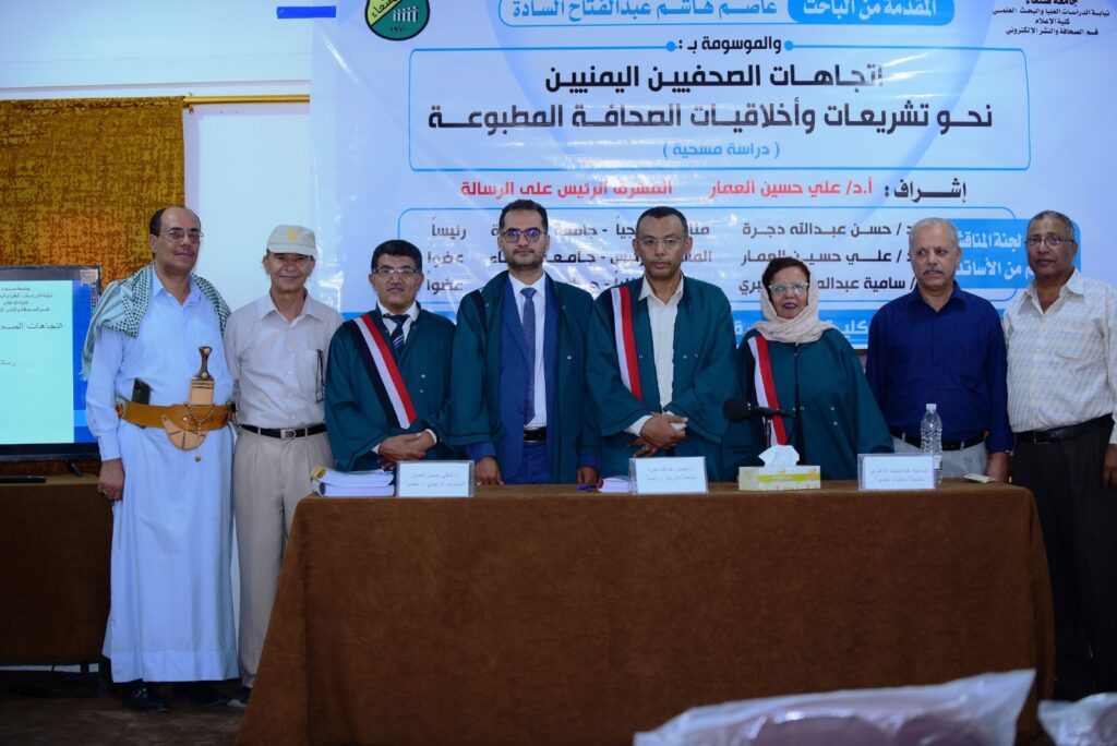 واشادت لجنة المناقشة والحكم برئاسة الدكتور حسين عبدالله دجرة استاذ الاذاعة والتلفزيون المشارك بجامعة الحديدة وعضوية الدكتور علي العمار استاذ الصحافة بجامعة صنعاء مشرف الرسالة والدكتورة سامية الاغبري استاذ الصحافة المساعد بجامعة صنعاء ممتحنا داخليا بمستوى مضمون الرسالة البحثية وأهميتها وبالنتائج التي توصل اليها الباحث في معرفة اتجاهات الصحفيين اليمنيين بتشريعات الصحافة، وأخلاقيات المهنة، والعوامل المؤثرة في تحديد تلك الاتجاهات سلبا وايجاباً.