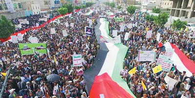 وعلى الرغم من كل ما يتعرض له الشعب اليمني من عدوان وحصار جائر وكل ما يترتب على ذلك من معاناة إنسانية وصحية صعبة أدت إلى فقدان الكثير من المقومات الأساسية للحياة الطبيعية والسليمة، وساهمت بتدمير الكثير من البنى التحتية للدولة المدنية في اليمن وانتشار المجاعة والأوبئة والأمراض على نطاق واسع وغير مسبوق في العالم باعتراف العديد من المنظمات الأممية والدولية والحقوقية، لا يتردد اليمنيون في الوقوف ورفع كلمة الحق بوجه كل طغاة العالم والمنطقة عند كل محطة توجب ذلك، فنرى الشعب اليمني ينزل إلى الساحات والميادين معلنا حضوره إلى جانب شعوب المنطقة والأمة ونصرة للقضايا المحقة وعلى رأسها القضية الفلسطينية ورفض كل المؤامرات والمخططات التي تحاك لتصفيتها وإنهاء حقوق الشعب الفلسطينية والتنديد بالقرارات الأمريكية التي اعتبرت القدس المحتلة عاصمة لكيان العدو ونقلت السفارة في الكيان الغاصب إلى القدس إلى جانب ما يسمى بصفقة القرن .