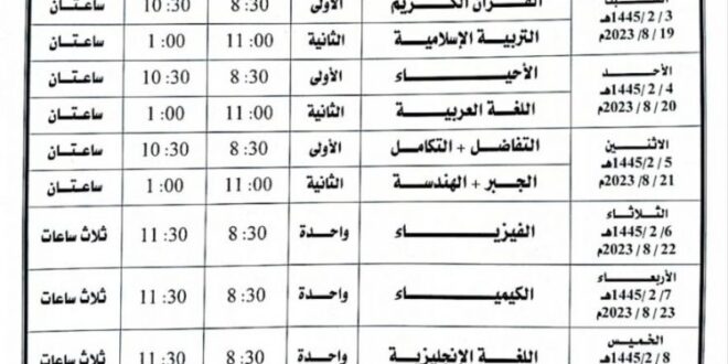 جدول الاختبارات العامة ( الدور الثاني) للشهادة الثانوية ( القسم العلمي) للطلبة المكملين ( مادة – مادتين – ثلاث مواد) للعام الدراسي 1444هـ 2022. – 2023م.