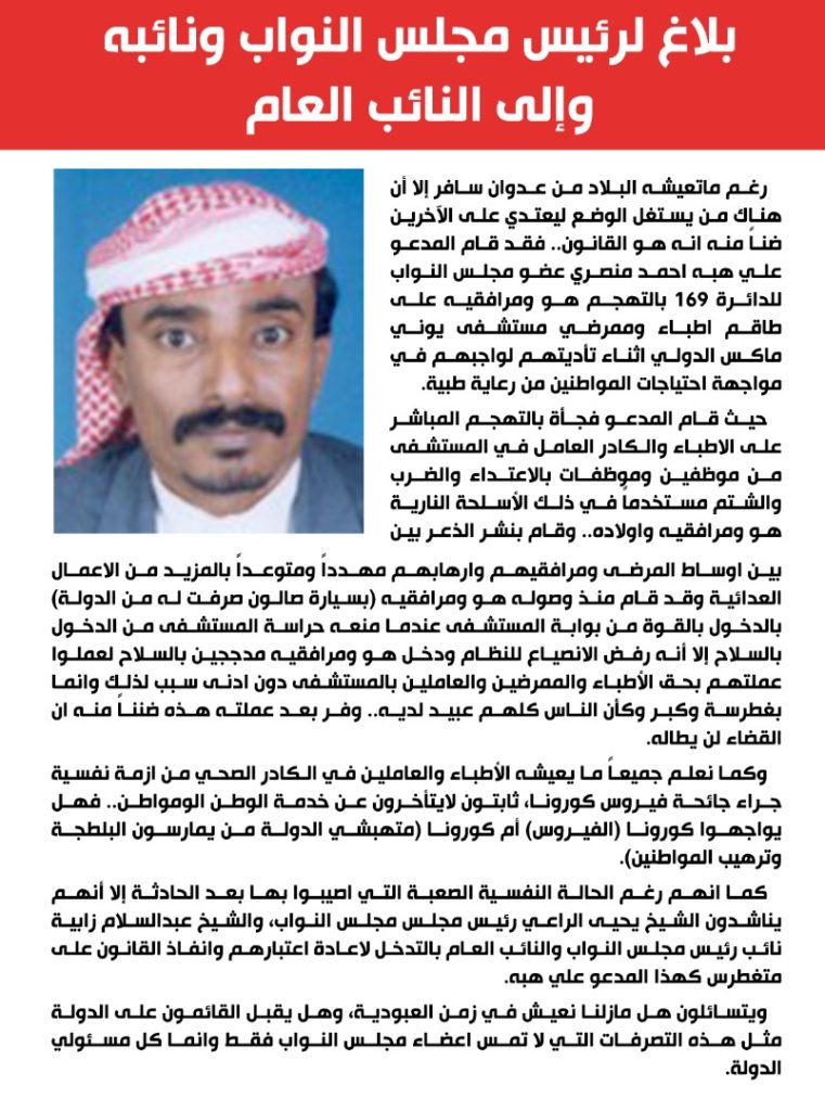 رغم ماتعيشه البلاد من عدوان سافر إلا أن هناك من يستغل الوضع ليعتدي على الآخرين ضناً منه انه هو القانون.. فقد قام المدعو علي هبه احمد منصري عضو مجلس النواب للدائرة 169 بالتهجم هو ومرافقيه على طاقم اطباء وممرضي مستشفى يوني ماكس الدولي اثناء تأديتهم لواجبهم في مواجهة احتياجات المواطنين من رعاية طبية.