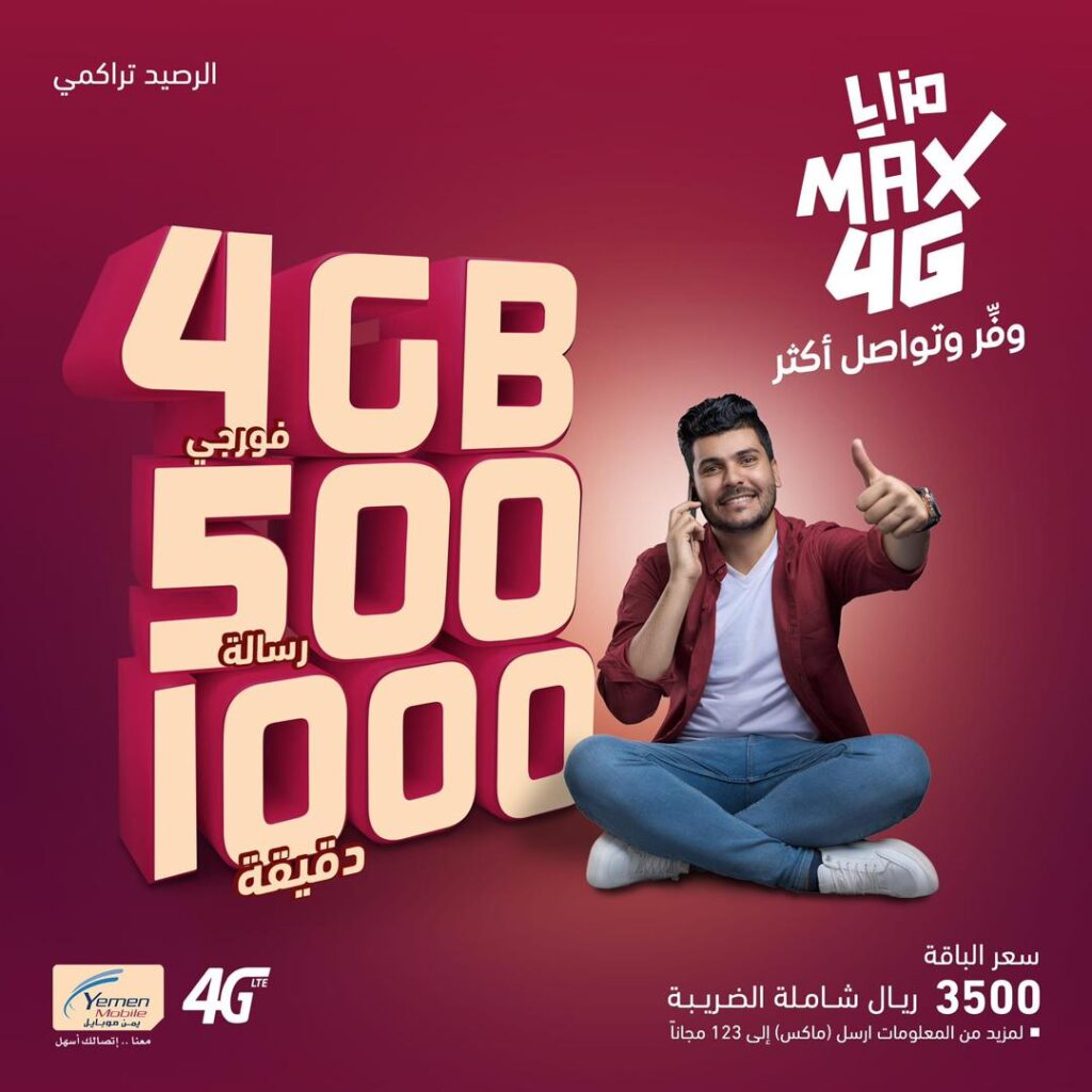 أطلقت شركة يمن موبايل باقة جديدة ومميزة باسم “مـــزايــا مـــاكــس فــورجــي” لمشتركي خدمة الدفع المسبق و الفوترة تتضمن هذه الباقة مجموعة متنوعة من الامتيازات الحصرية التي تلبي احتياجات ورغبات المشتركين وتمنحهم تجربة اتصال فريده ومتفوقة على مستوى اليمن .