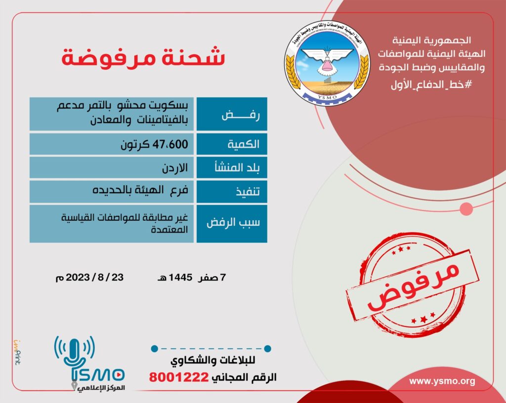 – رفضت الهيئة اليمنية للمواصفات والمقاييس وضبط الجودة شحنة بسكويت محشو بالتمر مدعم بالفيتامينات والمعادن مخالفة للمواصفات القياسية.