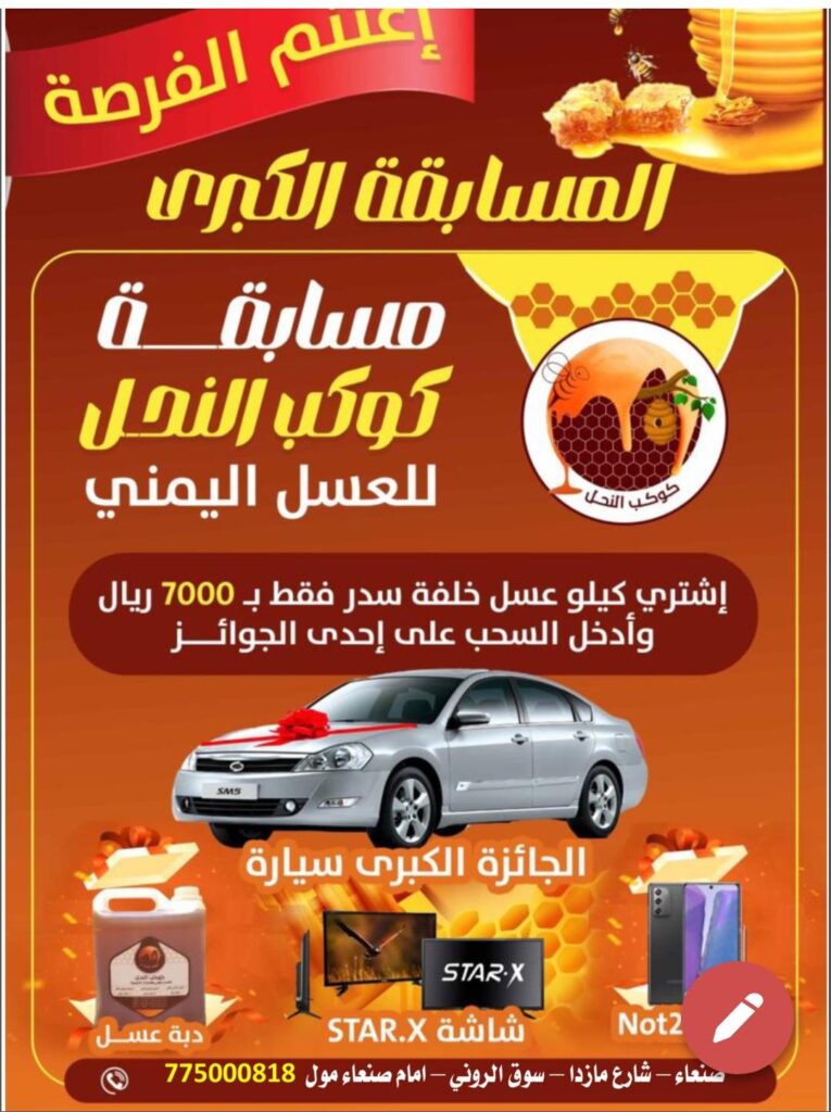 أعلن محل كوكب النحل للعسل اليمني الكائن في العاصمة صنعاء- الحصبة سوق الروني امام صنعاء مول- عن اقامة المسابقة الكبرى للمواطنين تتيح امامهم فرصة للفوز بأربع جوائز أولها سيارة سامسونج ورابعها دبة عسل سدر أصلي وبينهما الفوز بجهاز تليفون نت عشرين أ(وشاشة “x”سارت)
