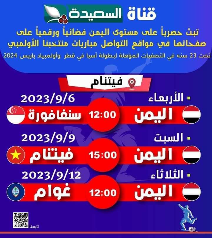 حصلت قناة السعيدة الفضائية على حق البث الحصري في الوطن العربي لنقل مباريات التصفيات المؤهلة لبطولة آسيا تحت سن 23 وأولمبياد باريس 2024.