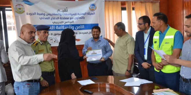 اختتم بصنعاء البرنامج التدريبي في الامن والسلامة العامة نظمه الهيئة اليمنية للمواصفات والمقاييس وضبط الجودة بالتعاون مع مصلحة الدفاع المدني.