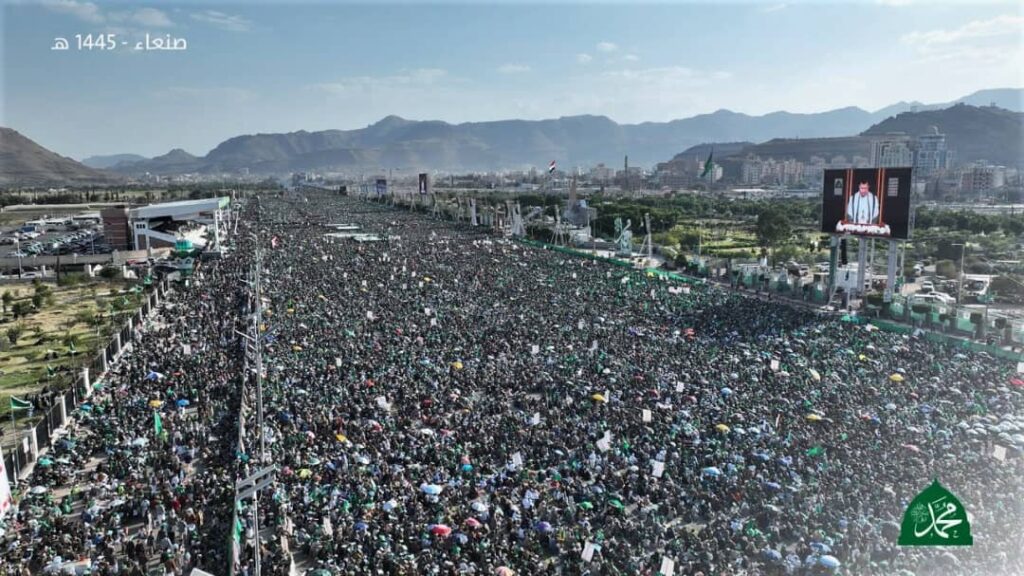 وتوسط الحشود المليونية اسم النبي محمد صلى الله عليه وآله وسلم، والذي كتب على لوحة خضراء أضفت على المهرجان المحمدي الأكبر روحانية خاصة عكست عمق المحبة والتبجيل والتعظيم الذي يكنه اليمنيون لخاتم الأنبياء وسيد المرسلين محمد صلى الله عليه وعلى آله وسلم ، كما اكتست ساحة ميدان السبعين بالأعلام الخضراء واللافتات التي حملت شعار “لبيك يا رسول الله” في مشهد إيماني لا يتكرر سوى في بلد الإيمان والحكمة، ومن قبل أبناء وأحفاد أنصار رسول الله صلى الله عليه وآله