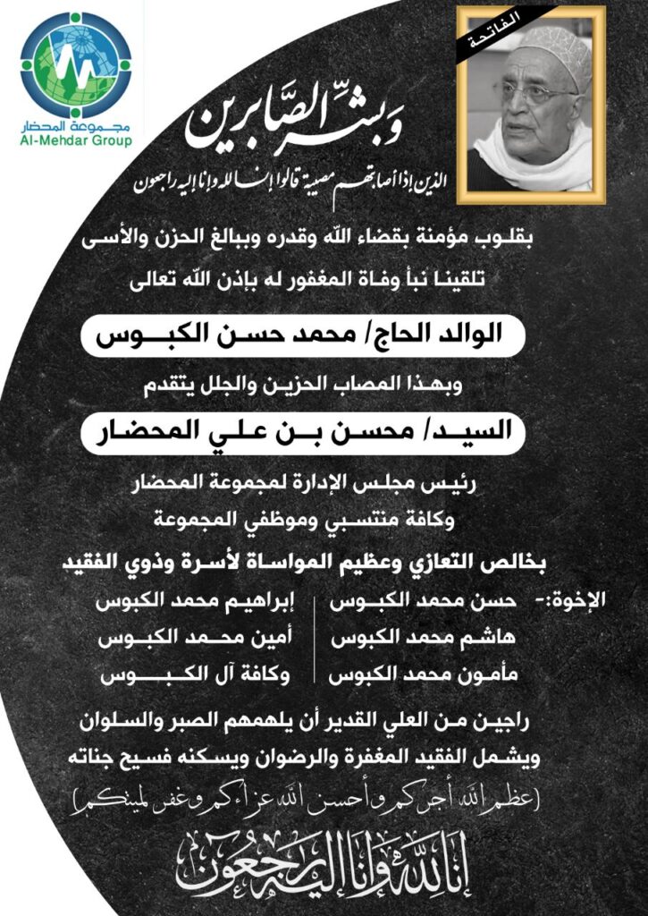 بقلوب مؤمنة بقضاء الله وقدره وببالغ الحزن والأسى تلقينا نبأ وفاة المغفور له بإذن الله تعالى الوالد الحاج/ محمد حسن الكبــوس وبهذا المصاب الحزين والجلل يتقدم السيـد/ محسـن بـن عـلـي المحضـار رئيس مجلس الإدارة لمجموعة المحضار