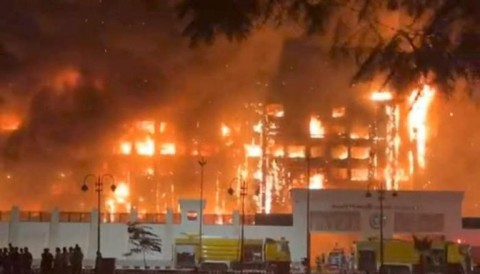 ورصدت صورا وفيديوهات للحريق المروّع الذي بدا مستعراً في عدة طوابق بالمبنى، ويرجح أنه تم تدمير مبنى مديرية أمن الإسماعيلية بالكامل.