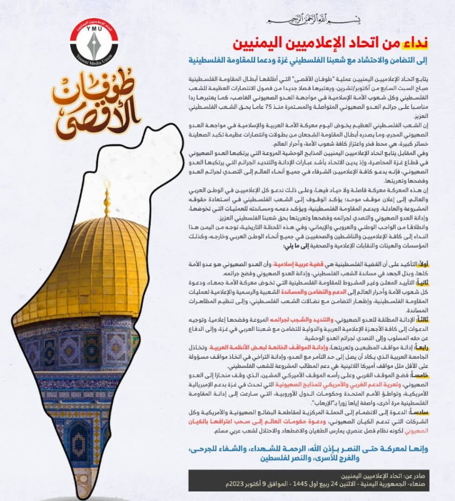■.. يتابع اتحاد الإعلاميين اليمنيين عملية “طوفان الأقصى” التي أطلقها أبطال المقاومة الفلسطينية صباح السبت السابع من أكتوبر/تشرين، ويعتبرها فصلا جديدا من فصول الانتصارات العظيمة للشعب الفلسطيني وكل شعوب الأمة الإسلامية في مواجهة العدو الصهيوني الغاصب، كما يعتبرها ردا مناسبا على جرائم العدو الصهيوني المتواصلة والمستمرة منذ 75 عاما بحق الشعب الفلسطيني العزيز.