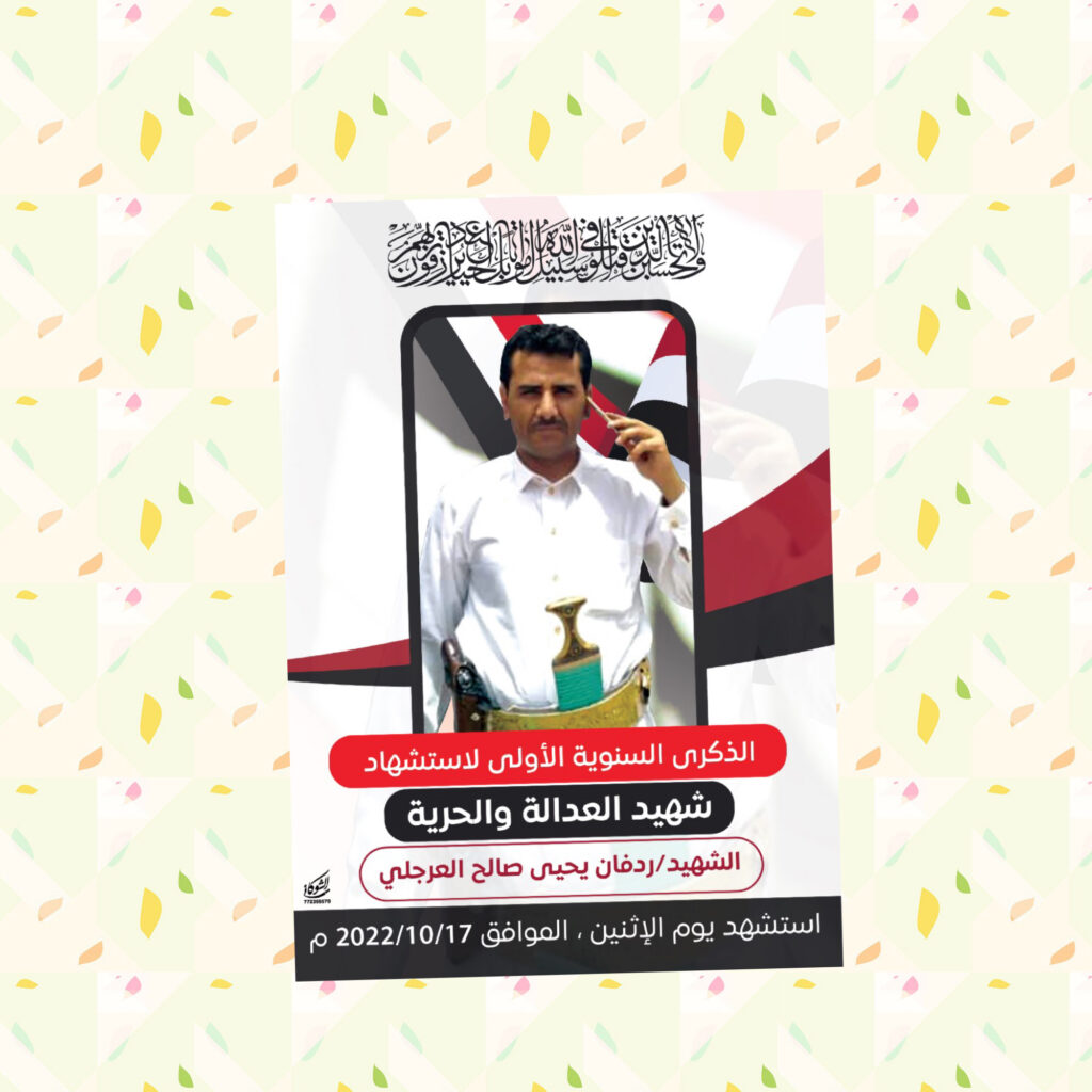 حلت يوم أمس الموافق السابع عشر من اكتوبر الذكرى السنوية الاولى لاستشهاد المجاهد العقيد/ردفان بن يحيى العرجلي الذي ارتقىشهيدا برصاص غادرة من قبل عصابة مسلحة نفذها المدعو القاتل بندر العسل مدير فرع هيئة الاوقاف بمحافظة اب بالتنسيق والدعمالمباشر من المدعو عبد المجيد الحوثي رئيس الهيئة العامة للأوقاف ومحمد جحاف وكيل هيئة الاوقاف واللذان ارتكبا جريمتهم النكراء فيوضح النهار بوسط العاصمة صنعاء والتي أسفرت كذلك عن إصابة الدكتور ناصر بن يحيى العرجلي رئيس حزب اليمن الحر بجروح بليغةوالذي بقى على اثرها وشقيقه الشهيد ردفان يحي العرجلي بالعناية المركزه بالمستشفى السعودي الالماني خمسه وعشرون يوما..حتى انتقلشقيقه الشهيد ردفان العرجلي إلى جوار ربه في تاريخ ٢٠٢٢/١٠/١٧وذلك على خلفية انتقاده لممارساتهما وما يقومان به من الفساد والنهبوالاستيلاء بدون وجه حق على أراضي وممتلكات المواطنين بمحافظة اب.