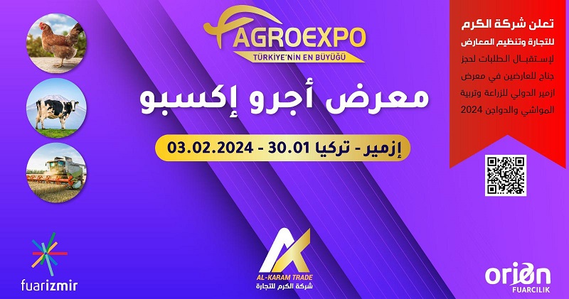 تنطلق في الثلاثين من يناير ٢٠٢٤ في مدينة ازمير التركيه فعالبات معرض أغرو إكسبو (إزمير) للزراعة والتربية الحيوانية والدواجن والذي تنظمه شركة الكرم للتجارة وتنظيم المعارض بالتعاون مع شركة اوريون
