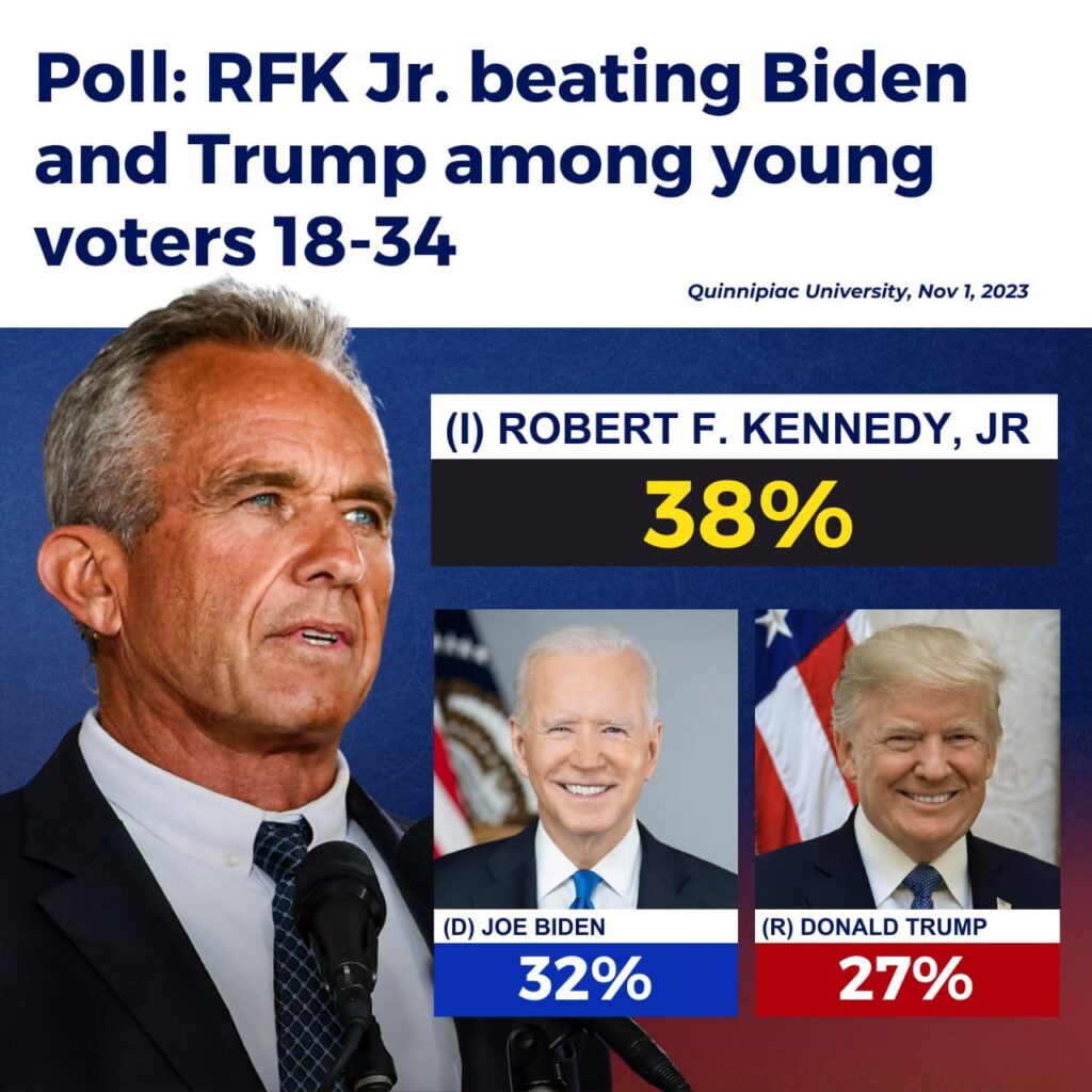 وفي إشارة وصفت بالتحذيرية “للديمقراطيين”، كان كينيدي هو الخيار الأول للناخبين الشباب الذين تتراوح أعمارهم بين 18 و34 عاماً، من بين السكان الذين شملهم الاستطلاع، فاختار 38 بالمائة منهم المحامي البيئي، ومن نفس الفئة العمرية اختار 32 بالمائة بايدن و27 بالمائة ذهب لترامب”