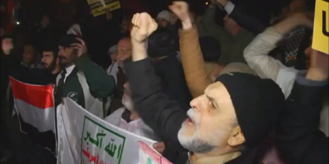 تظاهر مئات الإيرانيين أمام مقر سفارة المملكة المتحدة في طهران، تنديدًا بالعدوان الأمريكي البريطاني على اليمن.