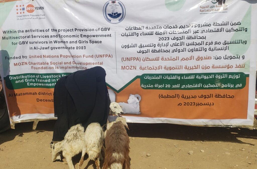 وقال المتوكل في تصريح لـ” اليمن الحر الاخباري”ان تلك الأهداف تأتي في إطار مشروع التمكين الاقتصادي وايضا تقديم خدمات متعددة القطاعات عبر المساحات الآمنه للنساء والفتيات بمحافظة الجوف وذلك بدعم من UNFPA Yemenو إشراف المجلس الأعلى لإدارة وتنسيق الشؤون الإنسانية-فرع الجوف . من أجل تأهيل النساء والفتيات في هذا البرامج في مجال تربية وتسمين الثروه الحيوانيه مشيرا بأنه تم تأهيل 80 امرأة في مديريات الغيل والمطمه بمحافظة الجوف وإكسابهن مهارات كيفية تربية الثروه الحيوانيه الاستفاده من مخرجاتها وكذا معرفة الامراض التي قد تصيبها وسبل تجنب هذه الأمراض وتم نهاية التدريب توزيع أدوات التمكين على المتدربات وهي ٤ رؤؤس اغنام من المجترات الصغيره ومظلات شمسيه وزمزميه وحقيبة ظهر