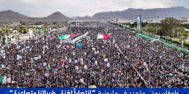 شهد “ميدان السبعين” بالعاصمة صنعاء وساحات المحافظات اليمنية حشود مليونية استمرارا لمساندة الشعب الفلسطيني، والوقوف معه حتى انتهاء العدوان الصهيوني في مسيرات تحت شعار “انتصاراً لغزة.. ضرباتنا متصاعدة”.