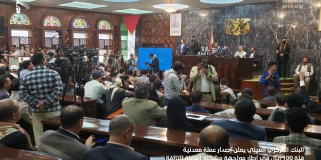 وأوضح أن البنك وهو يهدي هذا الإنجاز إلى أبناء الشعب اليمني، يؤكد على أنه ونتيجة للعدوان الظالم على اليمن وحربه على العملة الوطنية وتسببه في تراجع قيمتها مقابل العملات الأجنبية وانخفاضها مقابل الدولار الواحد من 215 إلى 530 ريالا، تحولت العملة الورقية فئة 100 ريال من عملة أساسية إلى عملة مساعدة يتم تداولها بشكل كبير من قبل أبناء الشعب، والذي جعل معالجة العملات المساعدة أولوية لدى البنك، ولذلك جاء الإصدار المعدني لفئة 100 ريال نظرا لطول العمر الافتراضي للعملات المعدنية مقارنة بالعملات الورقية.