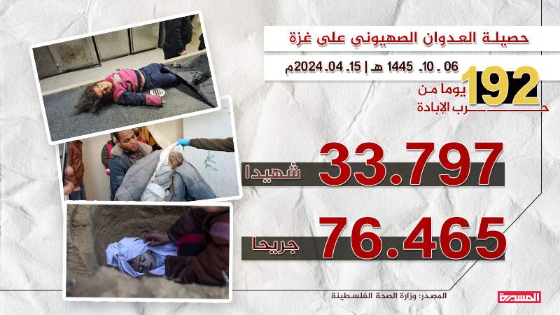 وأوضحت الوزارة أن حصيلة ضحايا العدوان الصهيوني على غزة منذ السابع من أكتوبر الماضي ارتفعت إلى 33.797 شهيدا و76.465 إصابة.