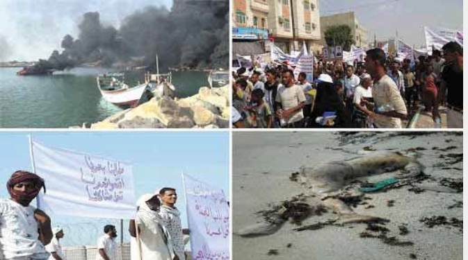 آخر تقارير الهيئة العامة لحماية البيئة التابعة لوزارة المياه والبيئة والصادر في مارس الماضي يتحدث عن تسبب النفايات السامة لسفن العدوان في المياه اليمنية بنفوق أعداد كبيرة من الأسماك خلال شهر مارس 2020 في أبين وعدن، وتغير لون مياه البحر إلى أخضر مع صعود رائحة كريهة من البحر بسبب تسرب كيميائي، ونفوق آلاف الأسماك في أكتوبر 2019 على سواحل منطقة بير علي في مديرية رضوم وبلحاف جنوب محافظة شبوة بسبب تسرب نفطي، ونفوق اسماك السردين بساحل أبين بعدن، ونفوق أسماك الجمبري على ساحل المكلا بحضرموت في مايو 2019، ونفوق كبير للأسماك في فبراير 2019 في مديرية رضوم وبلحاف بسبب تسريب نفطي، وقيام سفن إماراتية في مايو 2018 بجرف آلاف الأطنان من الأسماك وتدمير البيئة والشعاب المرجانية وعمل تفجيرات تحت الماء لجرف الأحجار الكريمة والصدف، وبسبب هذا الجرف الجاير تدمرت بيئة الأسماك وحصول تسمم لها، ونفوق أسماك التبانة في مارس 2018 على ساحل فوه في مدينة المكلا بحضرموت، وتكرر الأمر في ديسمبر 2017 بمديرية رضوم بشبوة قبالة ميناء تصدير النفط بالنشيمة بسبب تسرب النفط في مياه البحر، ومنطقة شوعب بسقطرى في أكتوبر 2017 بسبب التجريف البحري الذي تقوم به سفن أجنبية.