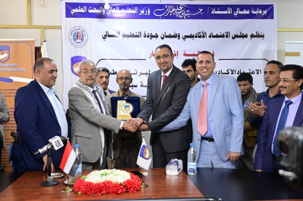 من جهته عبر رئيس جامعة سبأ الدكتور عمرو احمد النجار عن الشكر والعرفان لقيادات الوزارة والمجلس وعمادة الكلية وأعضاء هيئة التدريس وفريق المراجعين والمقيمين الخارجيين و لكل من ساهم وشارك في تنفيذ متطلبات الحصول على الاعتماد الأكاديمي منذ سنتين للوصول إلى هذه النتيجة .مشيدا بحرص قيادة الوزارة ومجلس الاعتماد الاكاديمي ومتابعتهم الحثيثة للجامعة بضرورة استيفاء متطلبات الاعتماد الأكاديمي الوطني لبرنامج طب الأسنان تمهيداً للتقدم للحصول على الاعتماد الدولي وفي ختام حفل الإشهار الذي حضره المدير التنفيذي لمركز تقنية المعلومات الدكتور فؤاد حسن عبد الرزاق، ، ﻣﻨﺢ ﻣﺠﻠﺲ اﻻﻋﺘﻤﺎد اﻷﻛﺎدﻳﻤﻲ درع اﻟﻤﺠﻠﺲ وﺷﻬﺎدة اﻻﻋﺘﻤﺎد اﻷﻛﺎدﻳﻤﻲ البرامجي ” الذهبي الكامل لـ” برنامج طب وجراحة الفم و الأسنان ” بجامعة سبأ ، وفقاً ﻟﻤﻌﺎﻳﻴﺮ وأدلة ونماذج اﻻﻋﺘﻤﺎد اﻷﻛﺎدﻳﻤﻲ اﻟﺒﺮاﻣﺠﻲ اﻟﺼﺎدرة ﻣﻦ اﻟﻤﺠﻠﺲ ﻟﻤﺪة ﺳﺒﻊ ﺳﻨﻮات”.