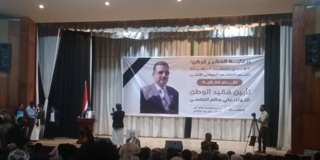 برعاية رئيس المجلس السياسي الاعلي المشير الركن مهدي محمد المشاط ، إقيم صباح اليوم الخميس حفل تآبين للقيادي المؤتمري اللواء علي سالم الخضمي في المركز الثقافي بصنعاء ، بحضور ريئس مجلس النواب يحيي الراعي ونوابه عبده الجندي ورئيس التلاحم القبلي الشيخ ضيف الله رسام ، والامين العام للموتمر الشعبي العام غازي محسن وعضو المكتب السياسي لانصار الله علي القحوم والامين العام المساعد للشؤون السباسية والعلاقات الخارجية الشيخ عبدالله مجيديع ، ورئيس الدائرة الإعلامية طارق الشامي، وعدد من أعضاء الهيئات البرلمانية والوزارية والشوروية وقيادات سياسية وحزبية والوجاهات القبلية ،