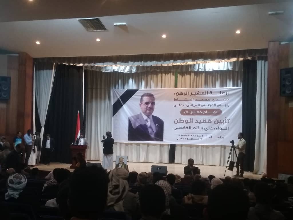 برعاية رئيس المجلس السياسي الاعلي المشير الركن مهدي محمد المشاط ، إقيم صباح اليوم الخميس حفل تآبين للقيادي المؤتمري اللواء علي سالم الخضمي في المركز الثقافي بصنعاء ، بحضور ريئس مجلس النواب يحيي الراعي ونوابه عبده الجندي ورئيس التلاحم القبلي الشيخ ضيف الله رسام ، والامين العام للموتمر الشعبي العام غازي محسن وعضو المكتب السياسي لانصار الله علي القحوم والامين العام المساعد للشؤون السباسية والعلاقات الخارجية الشيخ عبدالله مجيديع ، ورئيس الدائرة الإعلامية طارق الشامي، وعدد من أعضاء الهيئات البرلمانية والوزارية والشوروية وقيادات سياسية وحزبية والوجاهات القبلية ،