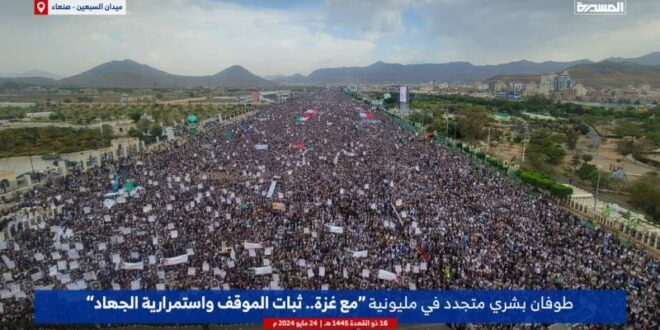 وكما في كل أسبوع وبزخم شعبي متواصل دون كلل أو ملل، امتلأ أكبر ميادين العاصمة صنعاء بحشود بشرية مليونية في أكبر المظاهرات التي تخرج عالميا نصرة للشعب الفلسطيني تلبية لدعوة السيد القائد عبدالملك بدرالدين الحوثي.