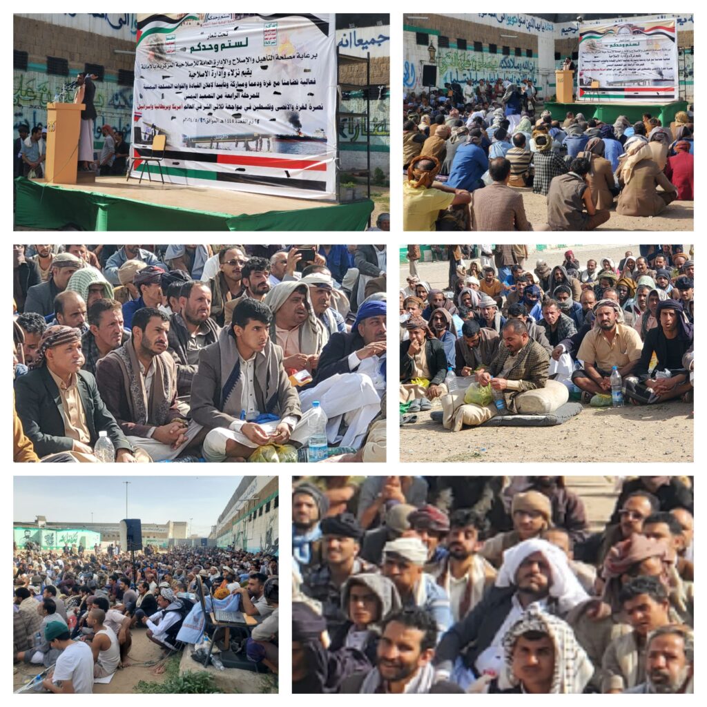 نظمّ عاملو ونزلاء الإصلاحية المركزية بأمانة العاصمة ، وقفة احتجاجية تضامنًا مع الشعب الفلسطيني ودعماً ومباركة وتاييداً لإعلان القيادة والقوات المسلحة اليمنية المرحلة الرابعة من التصعيد ، نصرة للشعب الفلسطيني ومقاومته الباسلة، في مواجهة العدو الصهيوني والأمريكي والبريطاني.