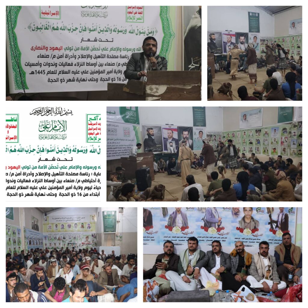 نظم السجن الاحتياطي بمحافظة صنعاء فعالية ثقافية احتفالاً بذكرى يوم الولاية بين أوساط النزلاء وتحت شعار ولاية الله ورسوله والامام علي تحصن الامة من تولي اليهود والنصارى برعاية رئاسة مصلحة التأهيل والإصلاح وإدارة أمن محافظة صنعاء.