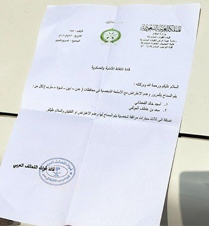 وبحسب الوثيقة الموجه من قائد التحالف في عدن، إلى قادة النقاط الأمنية والعسكرية في “عدن، أبين، شبوة، مأرب” السماح بمرور القيادي في تنظيم القاعدة سعد بن عاطف العولقي، وقائد “لواء النقل الثقيل” الموال للإصلاح أمجد خالد القحطاني، دون أي اعتراض.