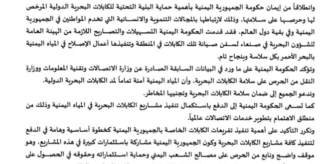 وتؤكد الحكومة اليمنية على ما ورد في البيانات السابقة الصادرة عن وزارة الاتصالات وتقنية المعلومات ووزارة النقل من الحرص على سلامة الكابلات البحرية، وأن المياه اليمنية آمنة تماماً لمد الكابلات البحرية الدولية.