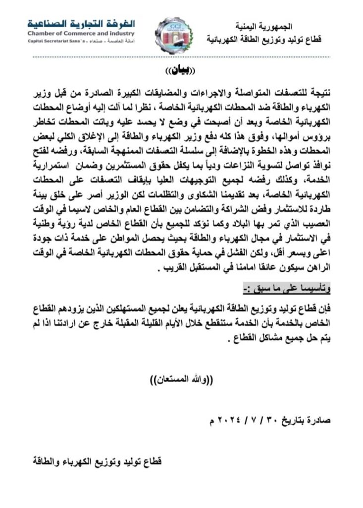 حذّر قطاع توليد وتوزيع الطاقة الكهربائية بالغرفة التجارية والصناعية بالامانة وجمعية محطات توليد الكهرباء الاهلية من انقطاع كلي لخدمة تزويد المواطنين بالكهرباء بعد أن أصبح المستثمرون في هذا القطاع يواجهون معاملات تعسفية وغير قانونية من قبل قيادة الكهرباء بحكومة صنعاء.