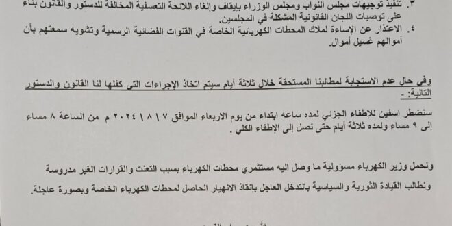 مؤكدين بانه في حال عدم الاستجابة لمطالبهم فانهم سيضطرون الى اتخاذ الإجراءات التي كفلها القانون والدستور والبدء بالاطفاء الجزئي لمدة ساعة ابتداء من يوم الأربعاء الموافق ٧_ اغسطس ٢٠٢٤ من الساعة ال٨ مساء الى الساعة ٩ مسآء لمدة ثلاثة أيام وصولا الاطفاء الكلي للتيار الكهربائي