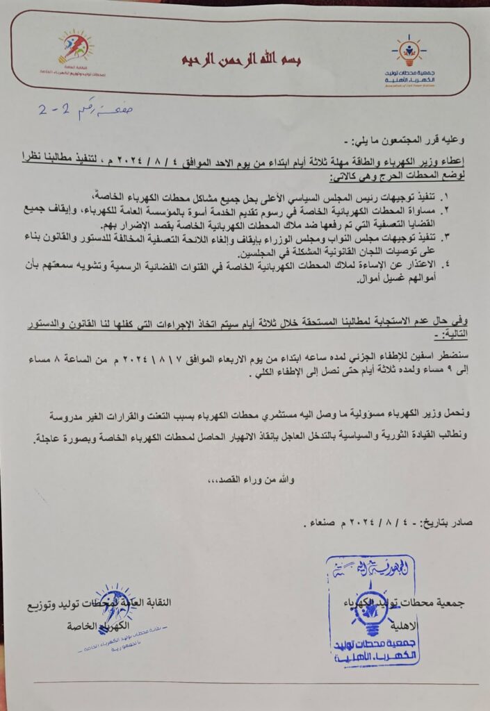 مؤكدين بانه في حال عدم الاستجابة لمطالبهم فانهم سيضطرون الى اتخاذ الإجراءات التي كفلها القانون والدستور والبدء بالاطفاء الجزئي لمدة ساعة ابتداء من يوم الأربعاء الموافق ٧_ اغسطس ٢٠٢٤ من الساعة ال٨ مساء الى الساعة ٩ مسآء لمدة ثلاثة أيام وصولا الاطفاء الكلي للتيار الكهربائي