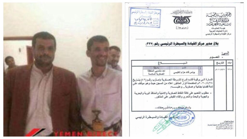 “إشارة إلى برقية قائد فرع الشرطة العسكرية م/ مأرب، رقم (42) بتاريخ 28/8/2020م، المتضمنة فرار المذكور أعلاه من السجن، حيث وهو موقوف على ذمة قضايا جنائية وعسكرية.. وعليه: