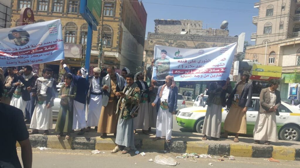 ودان المحتجون استمرار اعتقال المجاهد المقدم يحيى حزام الجائفي وضباط وأفراد القسم.