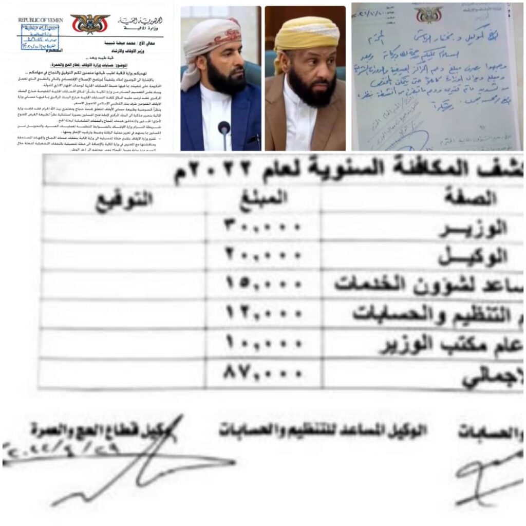 وأشارت الوثائق المسربة إلى صرف 87 الف ريال سعودي مكافأة، انفرد فيها الوزير شبيبة بنصيب الأسد، ما يقارب 15 مليون ريال يمني، فيما حصل وكيل قطاع الحج والعمرة مختار الرباش على 20 الف سعودي، أي ما يعادل عشرة ملايين ريال يمني.