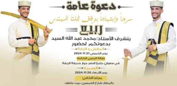 وبهذه المناسبة السعيدة نتقدم بأصدق التهاني القلبية لكافة آل السيد ، مع تمنياتنا للعريس والعروس بحياة زوجية سعيدة والذرية الصالحة ان شاء الله وعقبى البكاري.